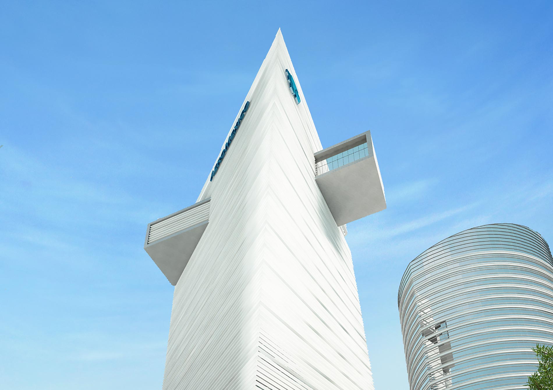 Inspired by the tail fin of a plane, this is a bold concept for Aeromexico’s HQ. Located on the famous Reforma Street, the angular structure is visually defined by the horizontal layers that wrap the building, aid airflow and form an outer layer for the building and its spectacular terraces.