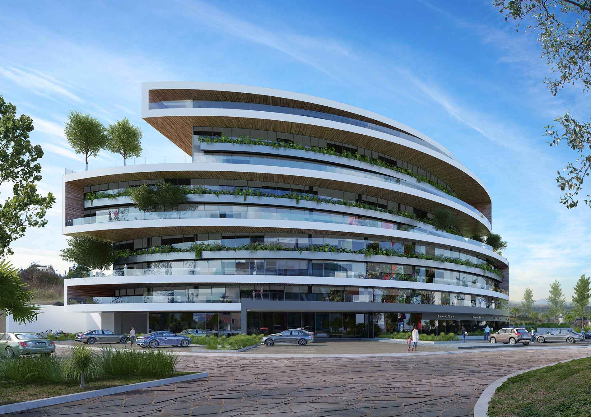 With extended walkways the plant lined terraces provide exceptional views to the city.