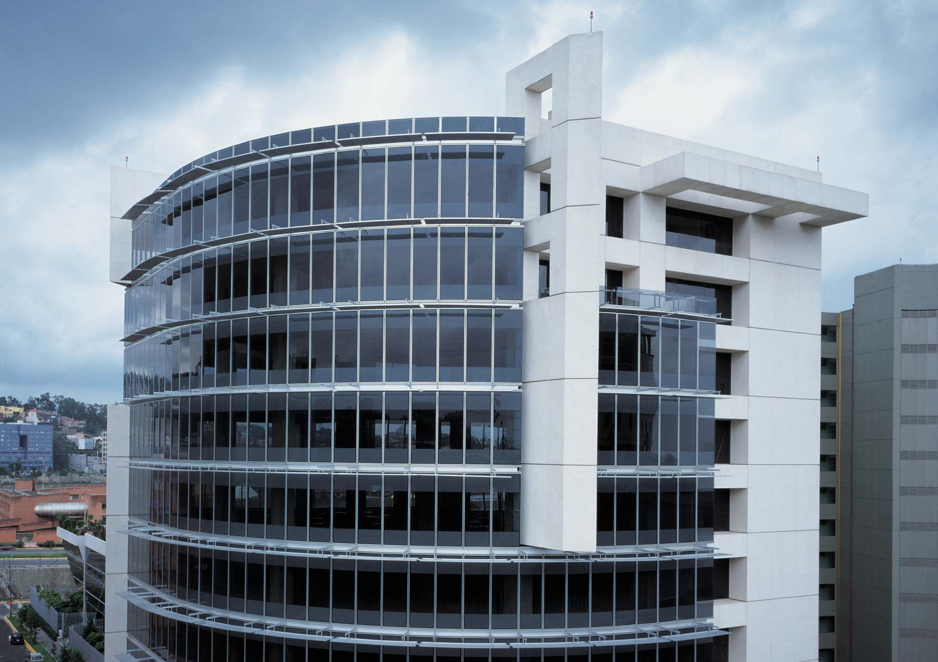 The signature of this building is the interplay between the vertical convex and horizontal concave curvatures of the inner and outer glass shells, juxtaposed with lime stone support.