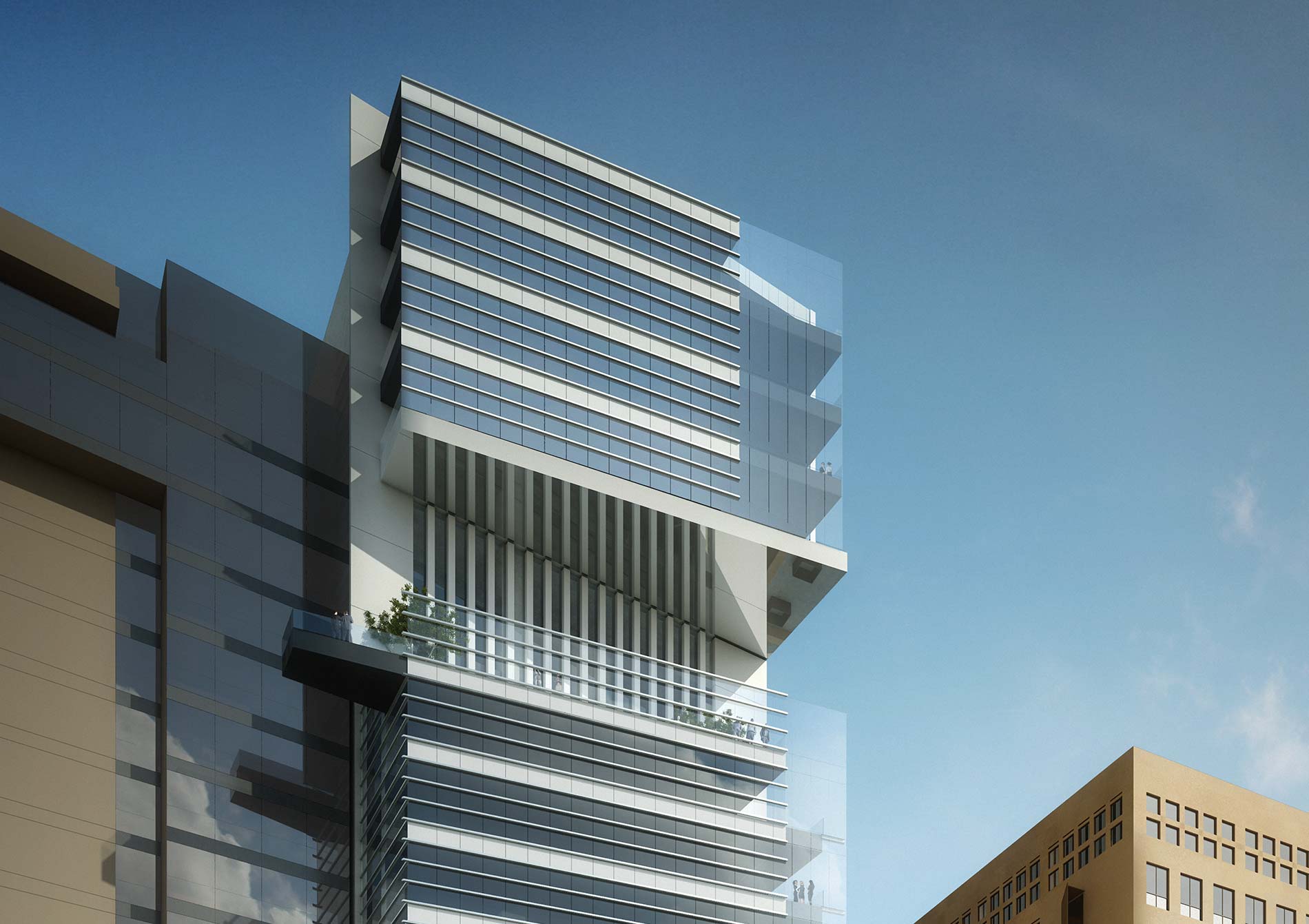 This Santa Fe mixed-use building combines offices with commercial high-end restaurants. Like all our buildings, all floors have terrace space. The larger tenth-floor terrace not only offers sweeping views of the city, its mirrored roof adds a unique feel of the resident’s lounge and bar office.