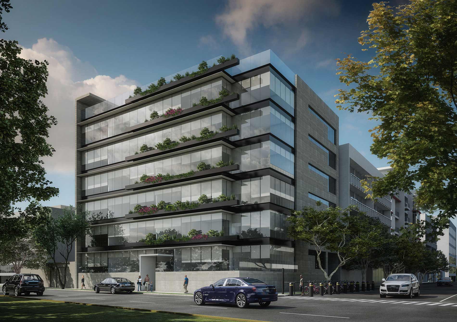 This high end, twelve apartment glass complex located in Horacio Avenue in the upscale Polanco neighborhood integrates a combination of black aluminum panels, transparent glass, and floating planters that rise six floors above the entrance level. The combination of exposed concrete, transparent glass and black aluminum reinforces its premium quality.